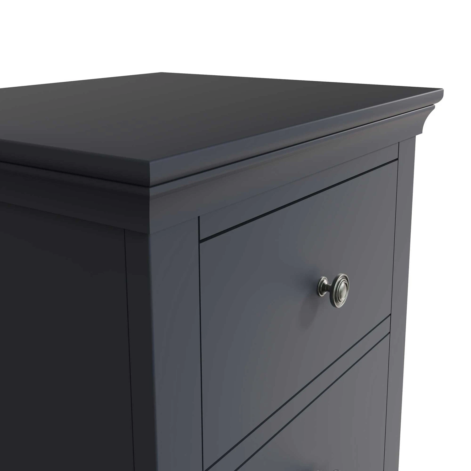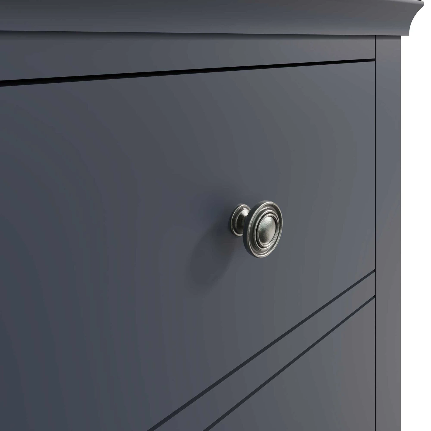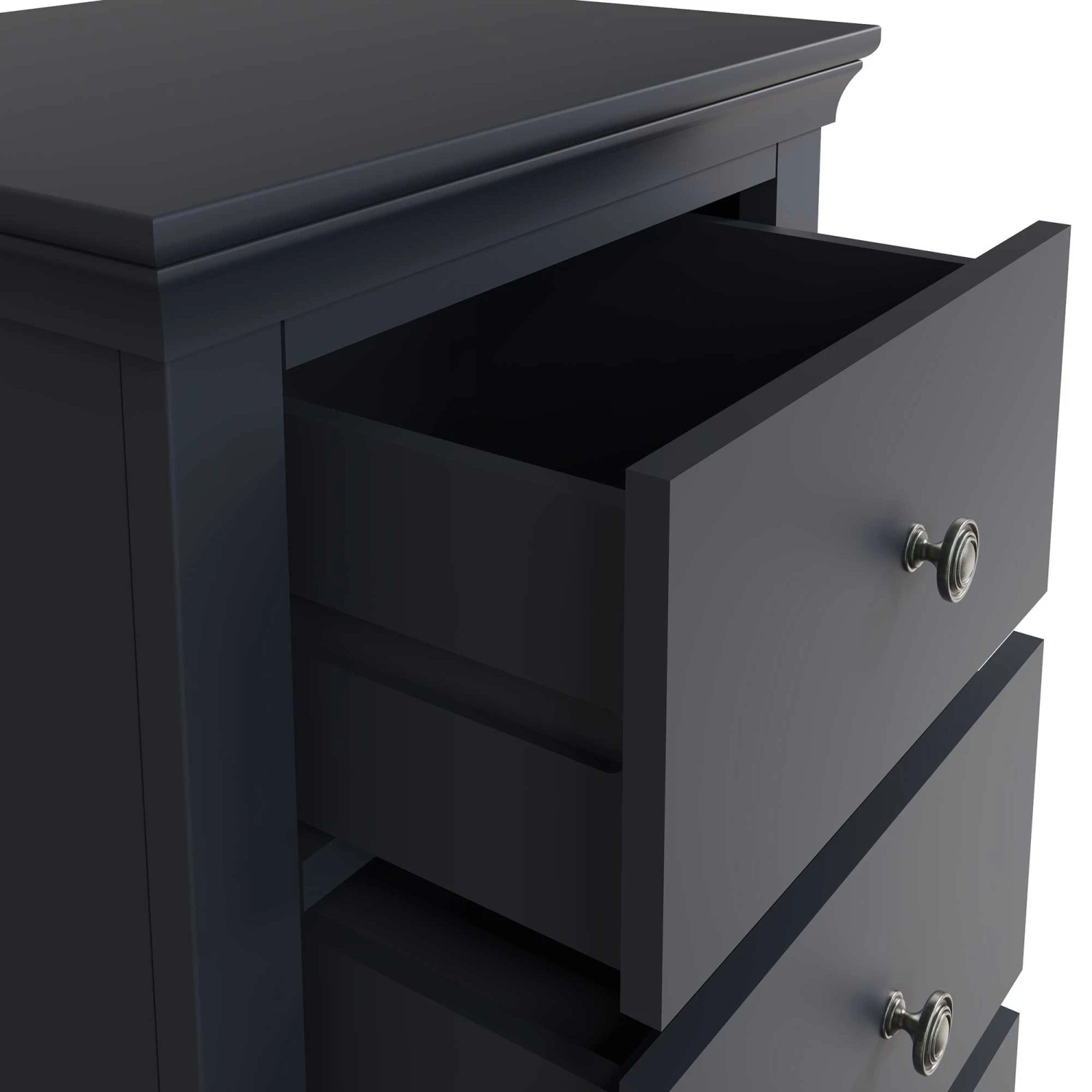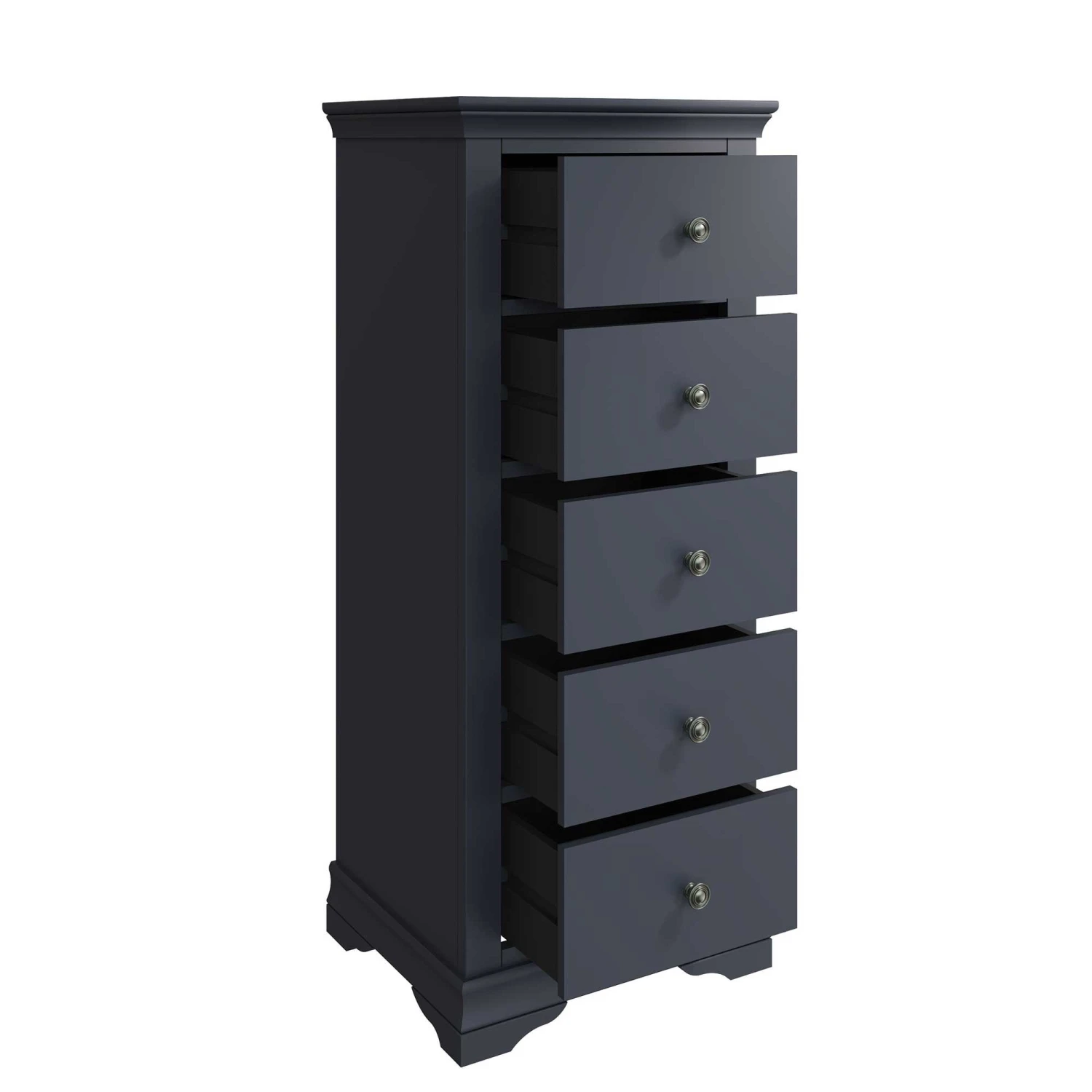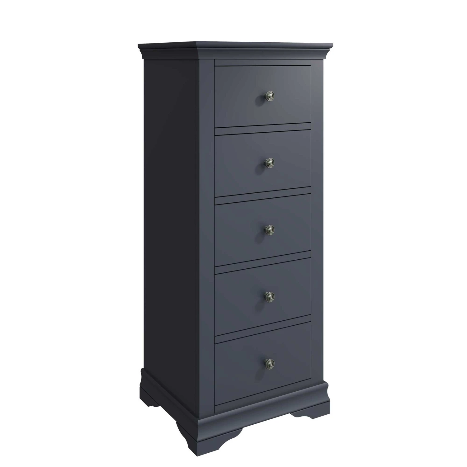 This beautiful Swindon Midnight Grey 5 Drawer Wellington Chest will add a timeless and elegant look to any modern bedroom. This tallboy design wellington chest is complete with 5 spacious drawers, providing plenty of storage for all your clothing and personal belongings. The narrow chest has a painted midnight grey finish and is decorated with pewter effect handles and unique shaped legs for a stunning, contemporary look. Matching items available.