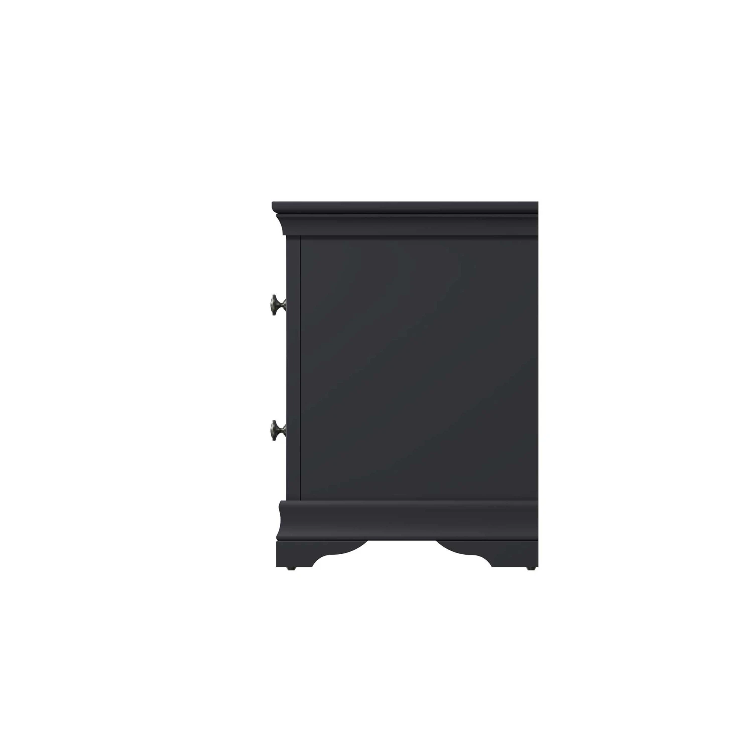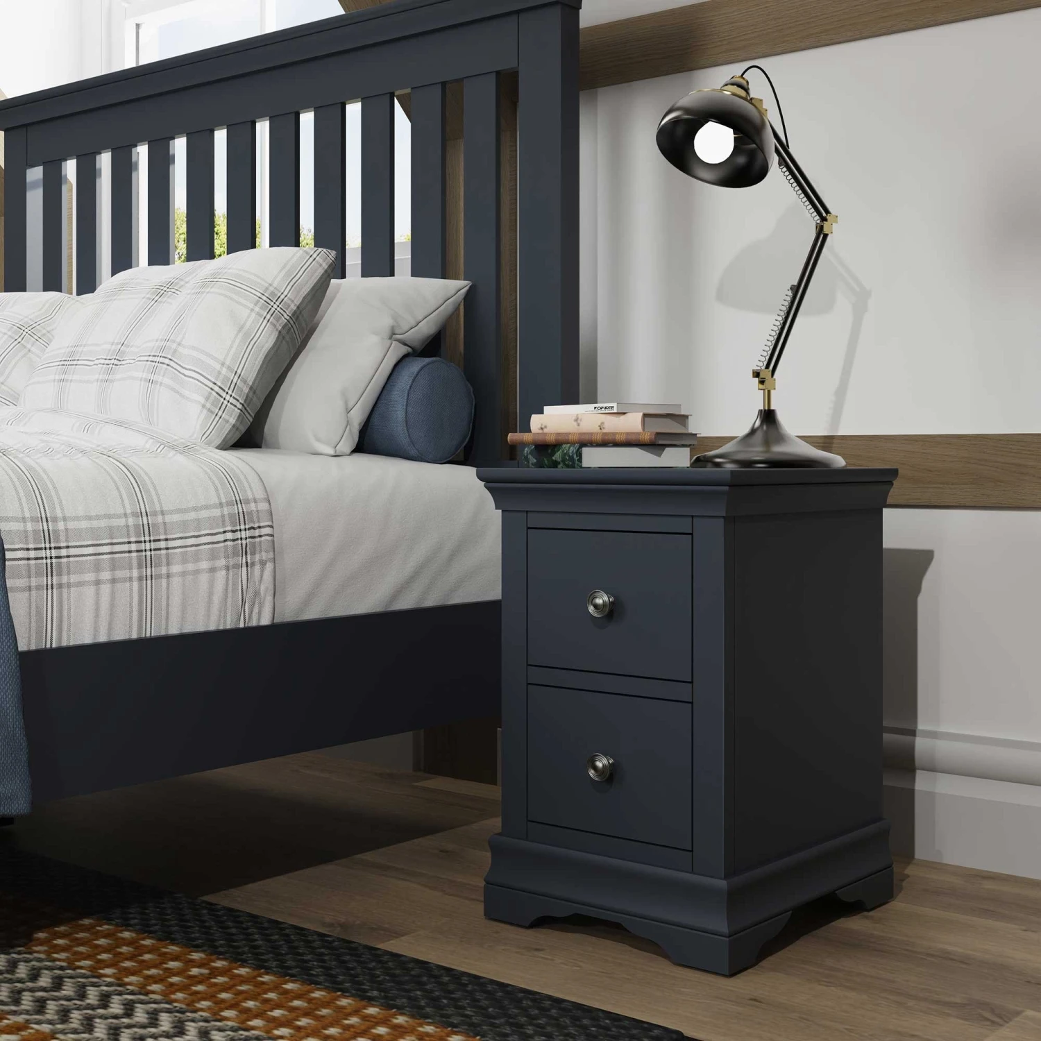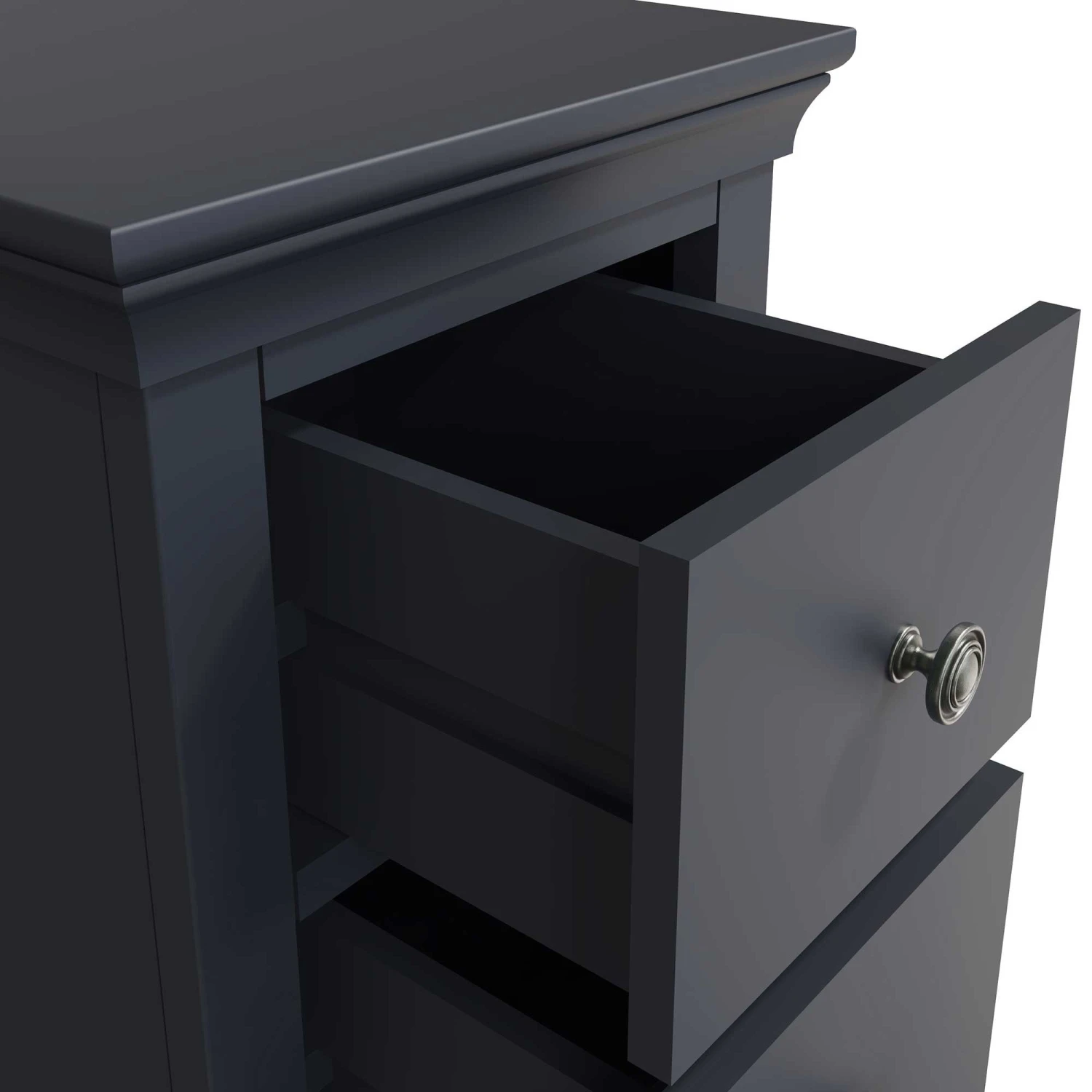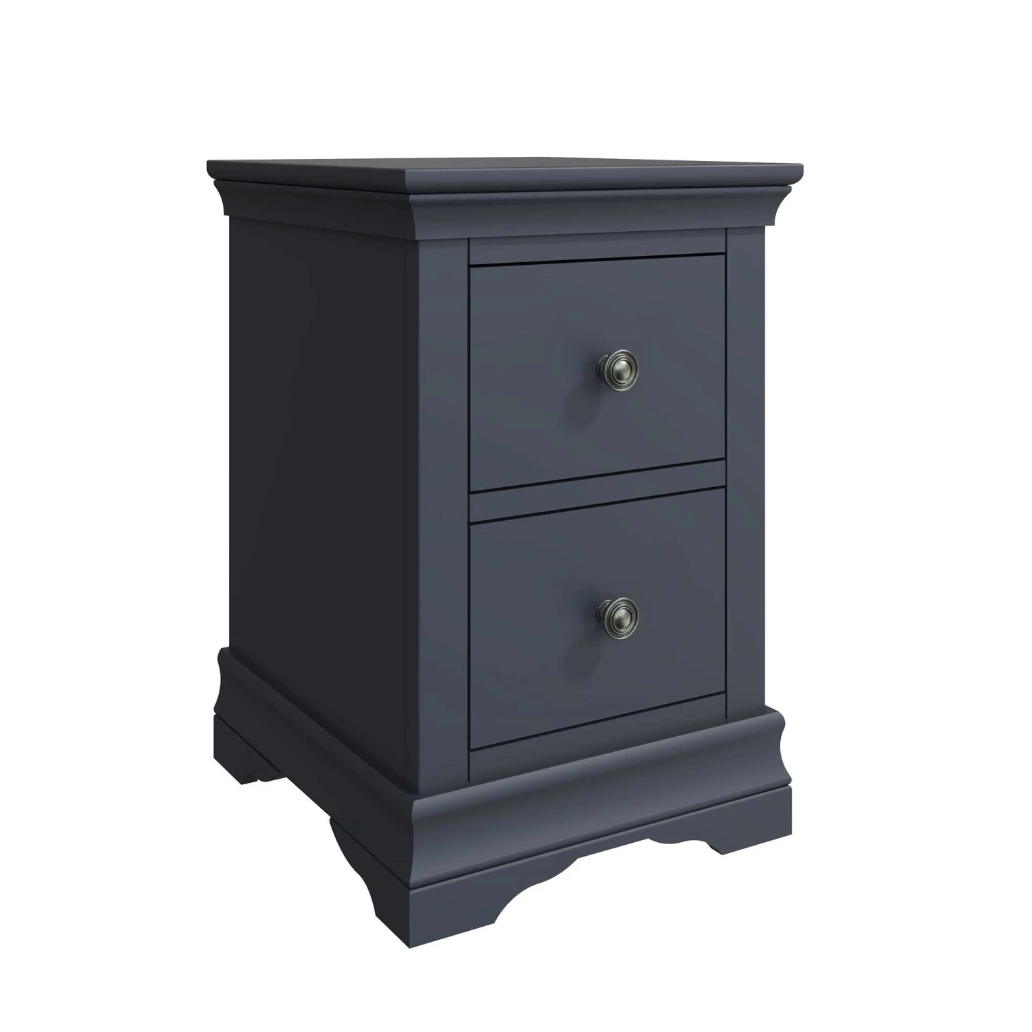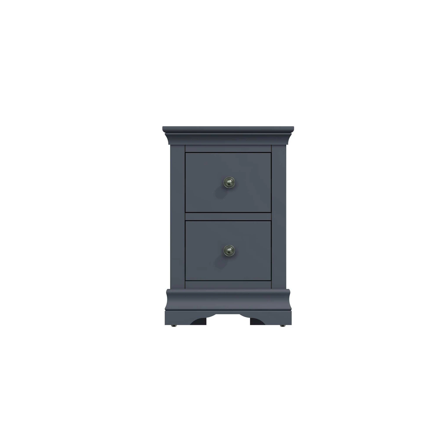 This timeless Swindon Midnight Grey Small Bedside Cabinet will suit any modern bedroom perfectly. Part of the new Swindon Midnight Grey Bedroom Collection, this modern bedside cabinet features 2 small drawers, ideal for storing your personal belongings. This beautiful bedside is finished with pewter effect drawer handles and unique shaped legs. Matching items available.