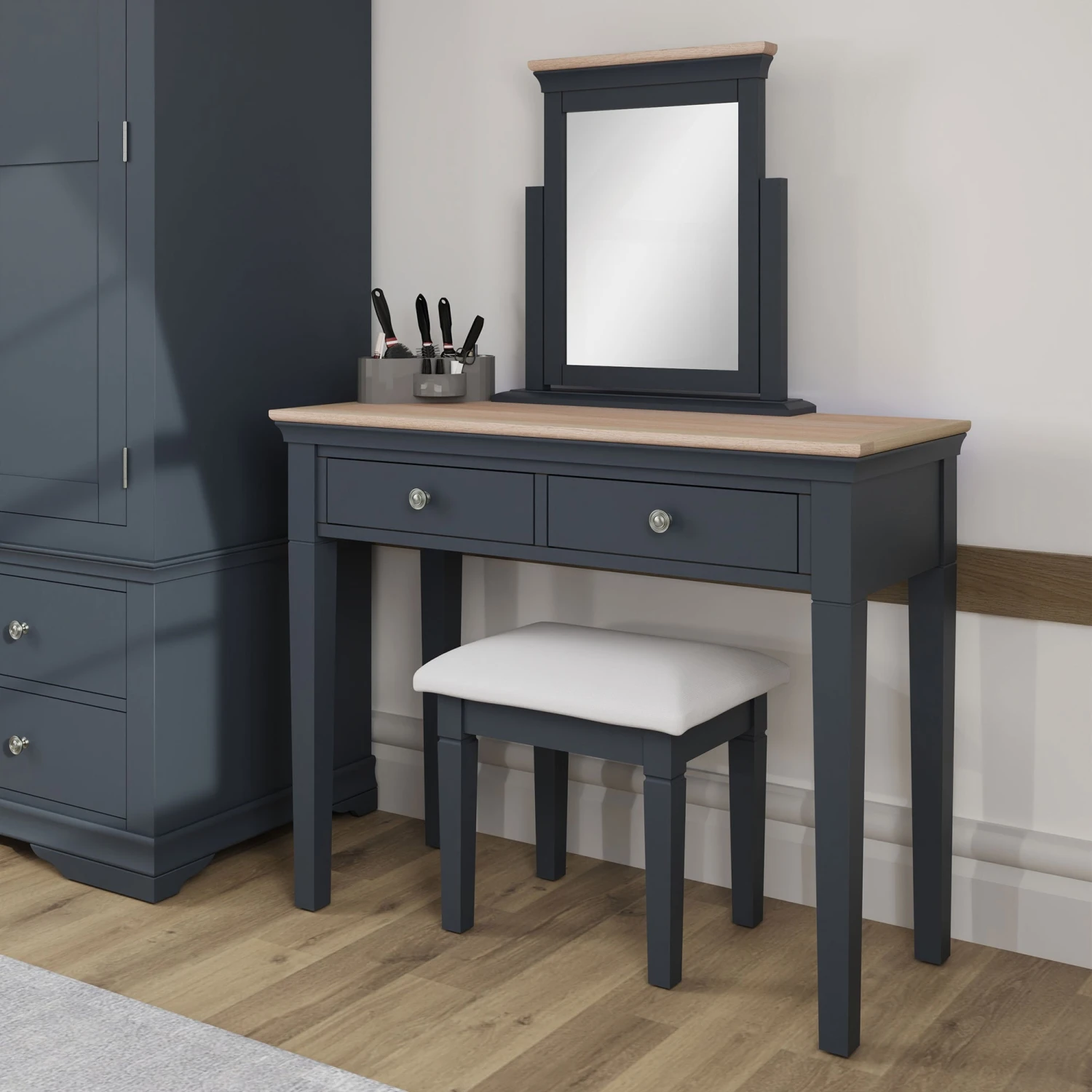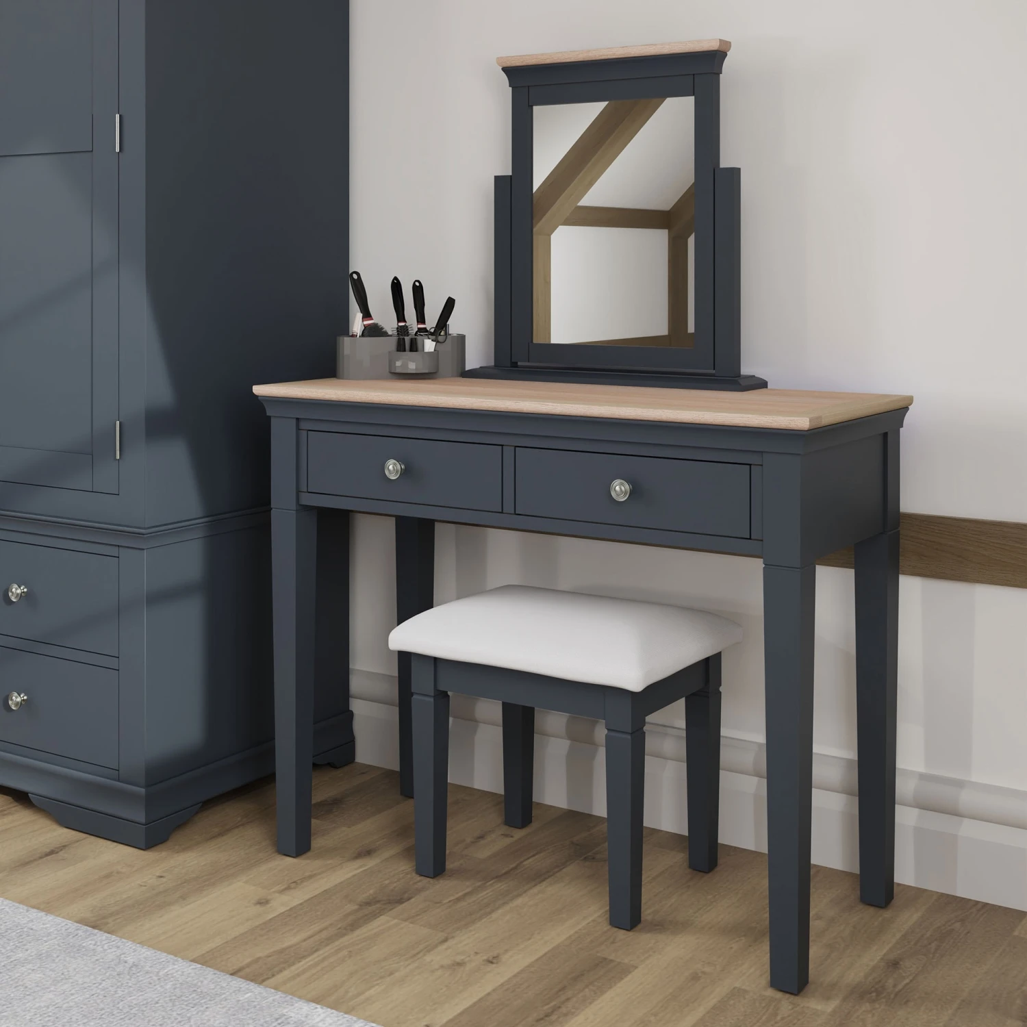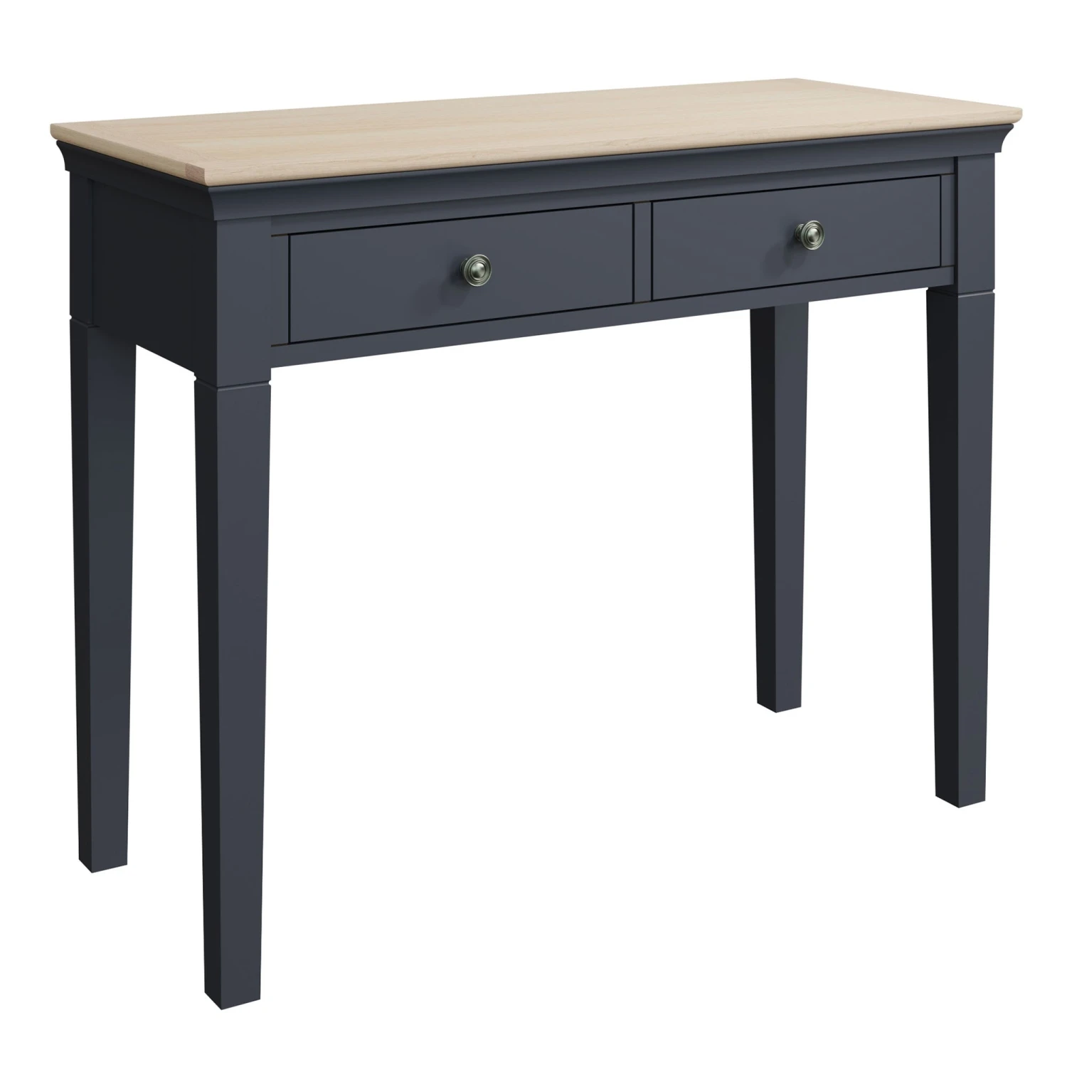 Bring an elegant touch to your bedroom with this stunning designed Swindon Oak Midnight Grey Dressing Table. The dressing table is made from wood in a beautiful midnight grey paint, there are 2 spacious drawers that run on wooden guides and are finished with pewter effect handles for a decorative touch. The dressing table will look stunning paired with a matching trinket mirror or wall mirror and stool to complete the look.