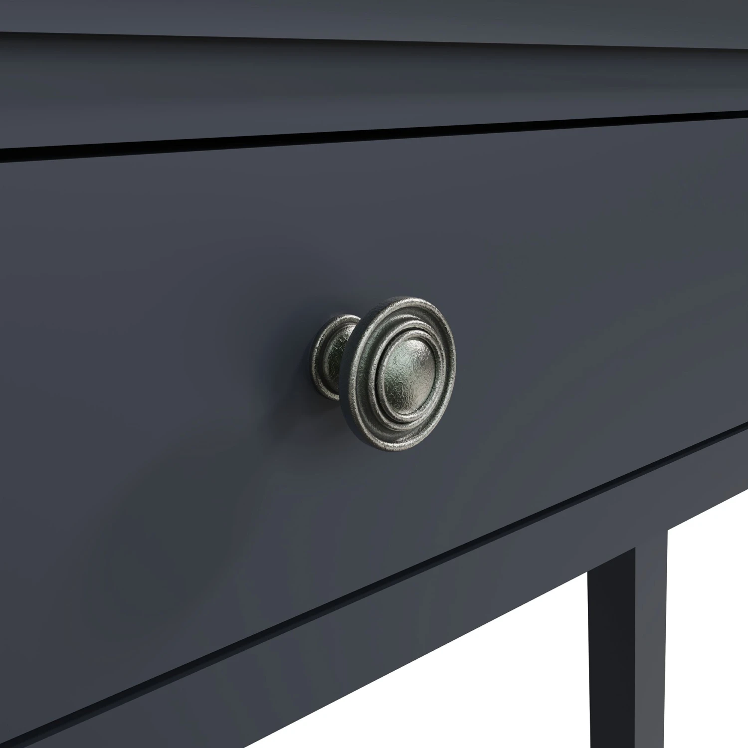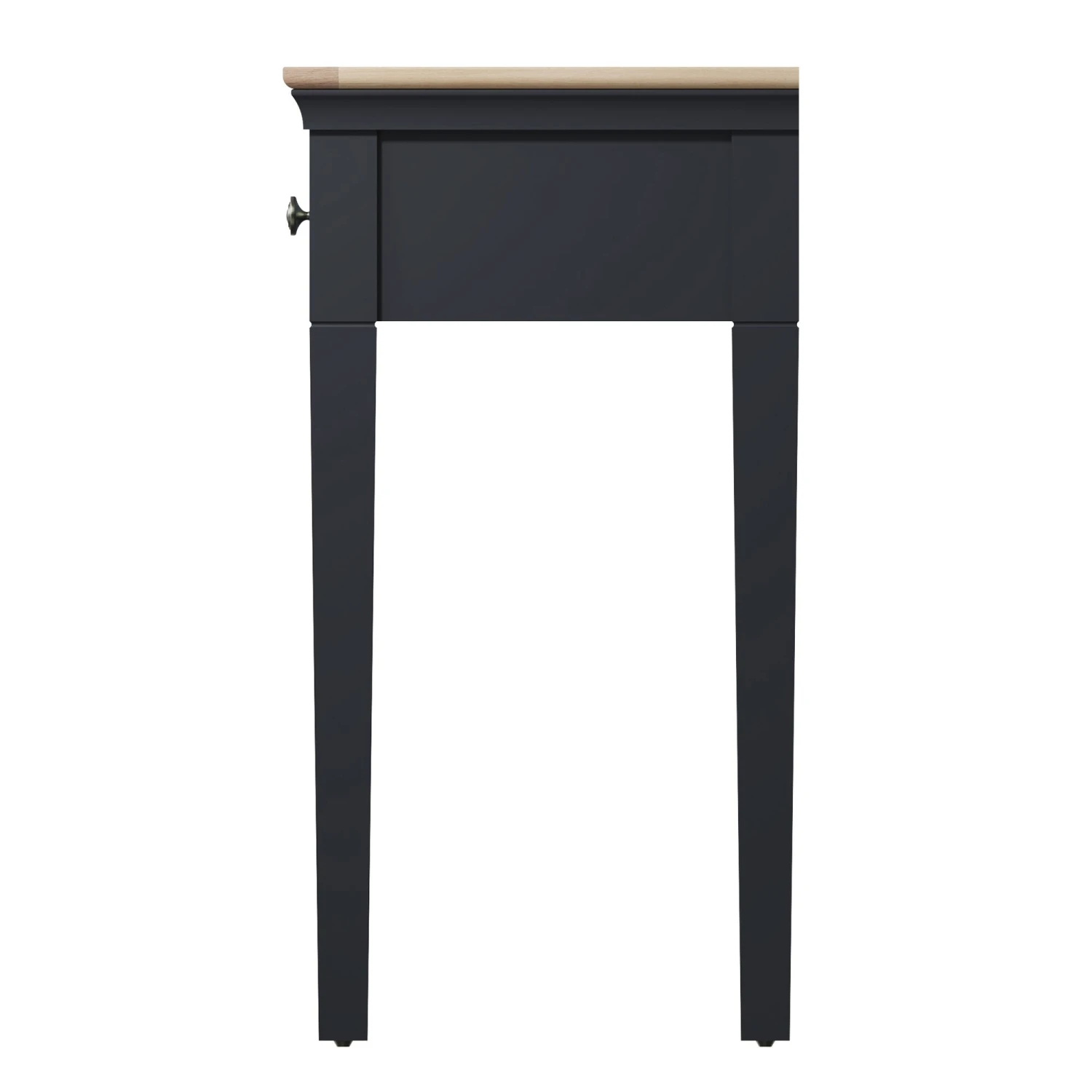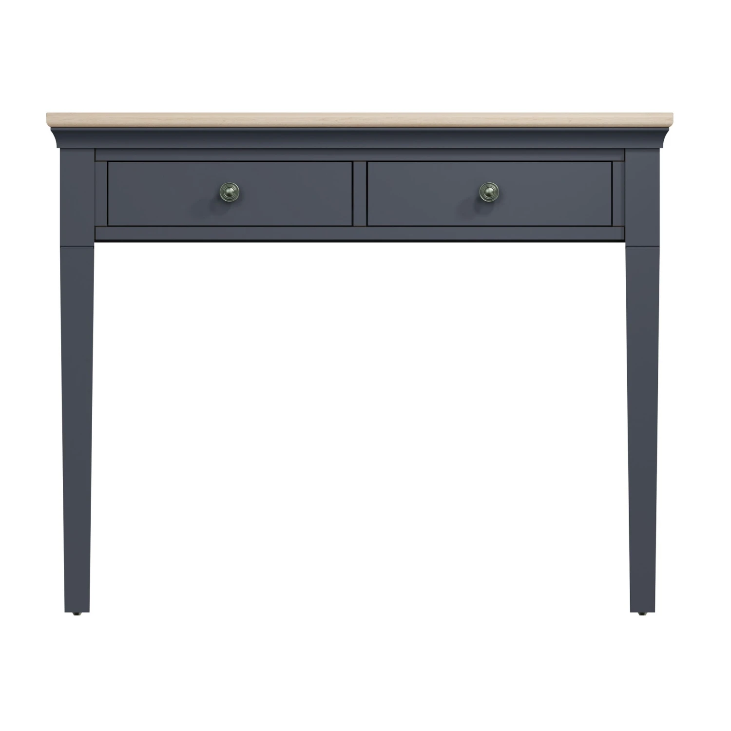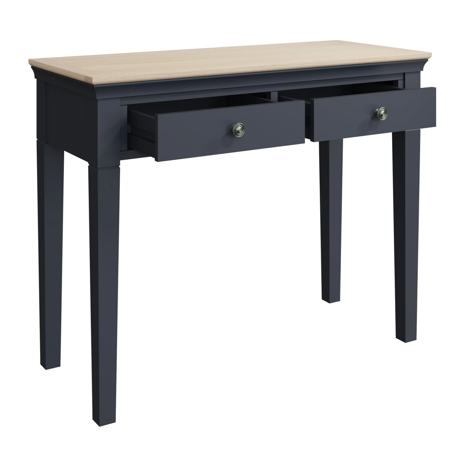 Bring an elegant touch to your bedroom with this stunning designed Swindon Oak Midnight Grey Dressing Table. The dressing table is made from wood in a beautiful midnight grey paint, there are 2 spacious drawers that run on wooden guides and are finished with pewter effect handles for a decorative touch. The dressing table will look stunning paired with a matching trinket mirror or wall mirror and stool to complete the look.