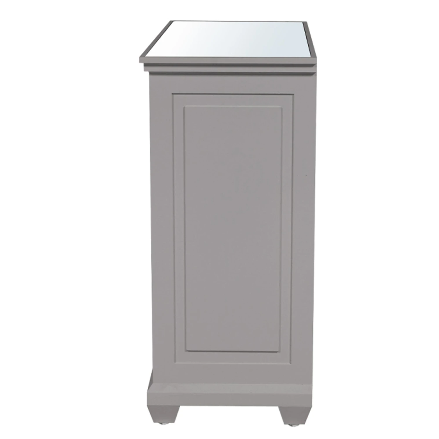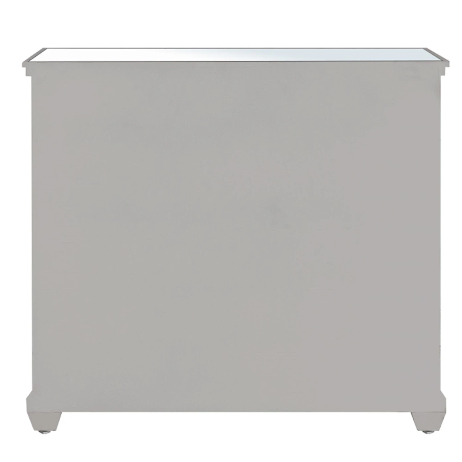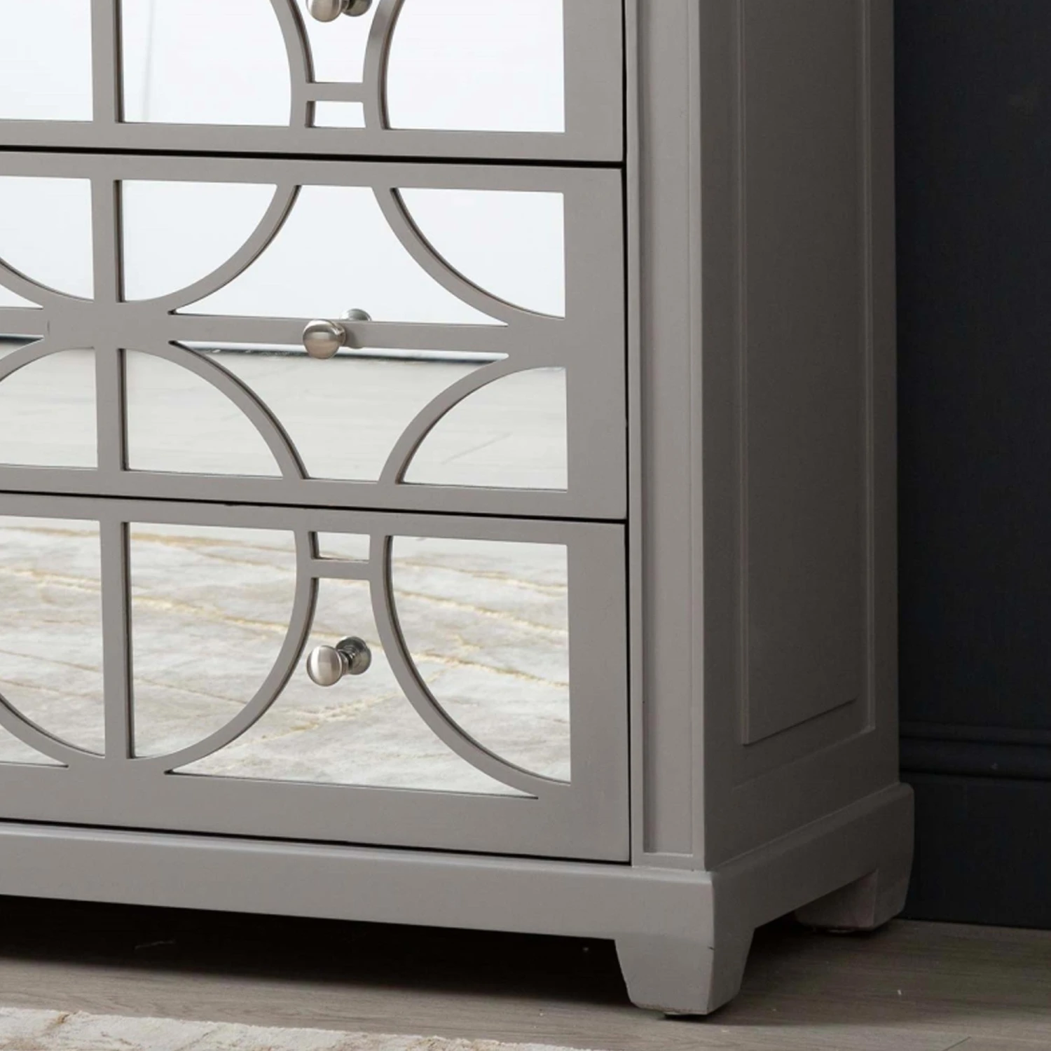 Blending a modern yet traditional design the Torino 3 Drawer Chest Grey Mirror Top feature a mirror panelling design to the front of the drawers, overlaid with grey wood to create geometric circular design. There are 3 spacious drawers with complimenting metal handles, the drawer is crafted from a beautiful glossy grey wood and trimmed with a mirrored top. Whether you are displaying in your bedroom or living room these stunning drawers will make a statement piece.