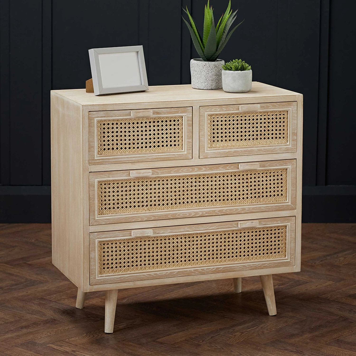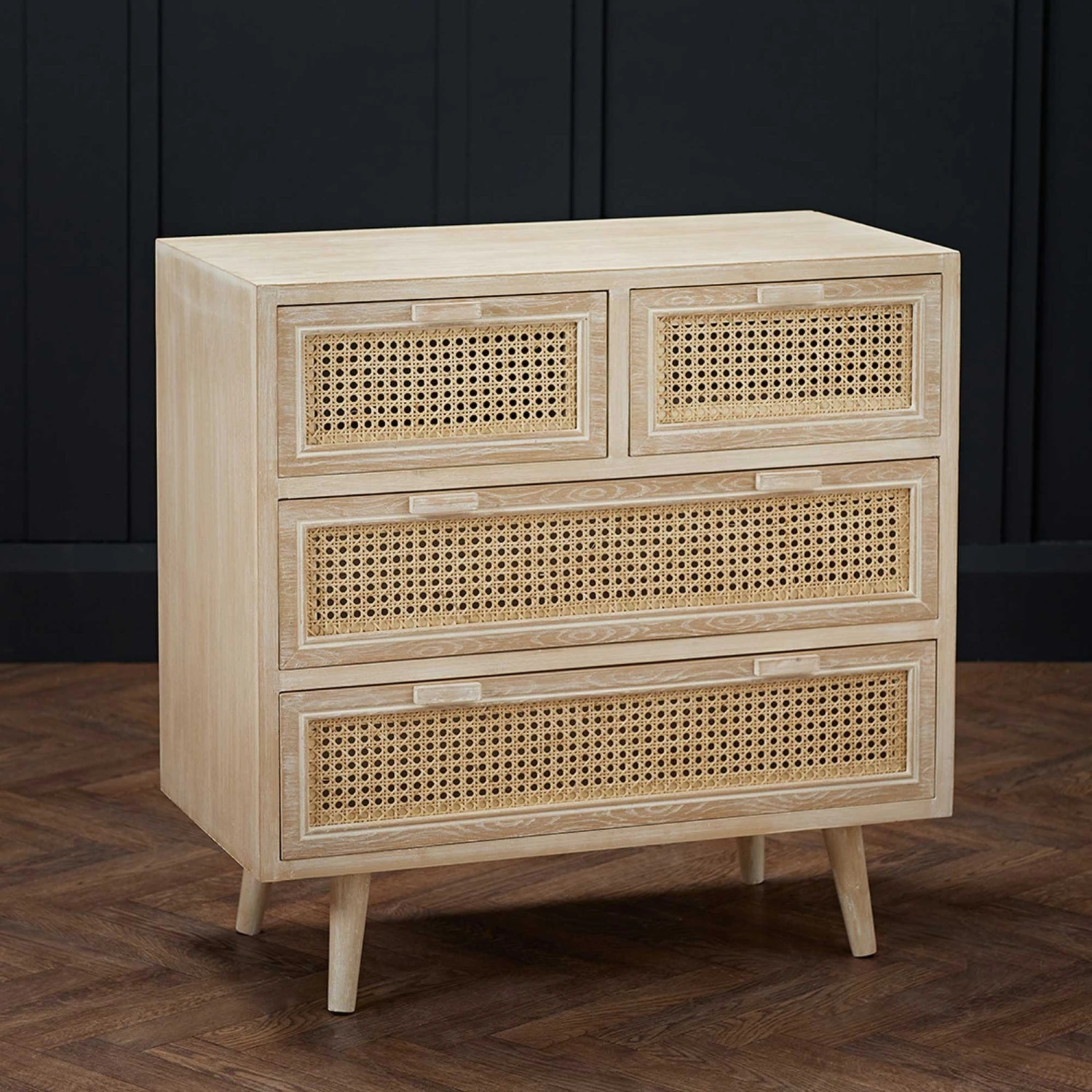 This light washed oak effect Toulouse 2+2 Rattan Drawer Chest is a trendy solution for all your storage needs. The 2+2 drawer chest features 2 large drawers and 2 small drawers decorated with rattan style front panels. This 2+2 drawer chest is part of the Toulouse range and can be mixed and matched with any other Toulouse furniture to complete your collection!Â