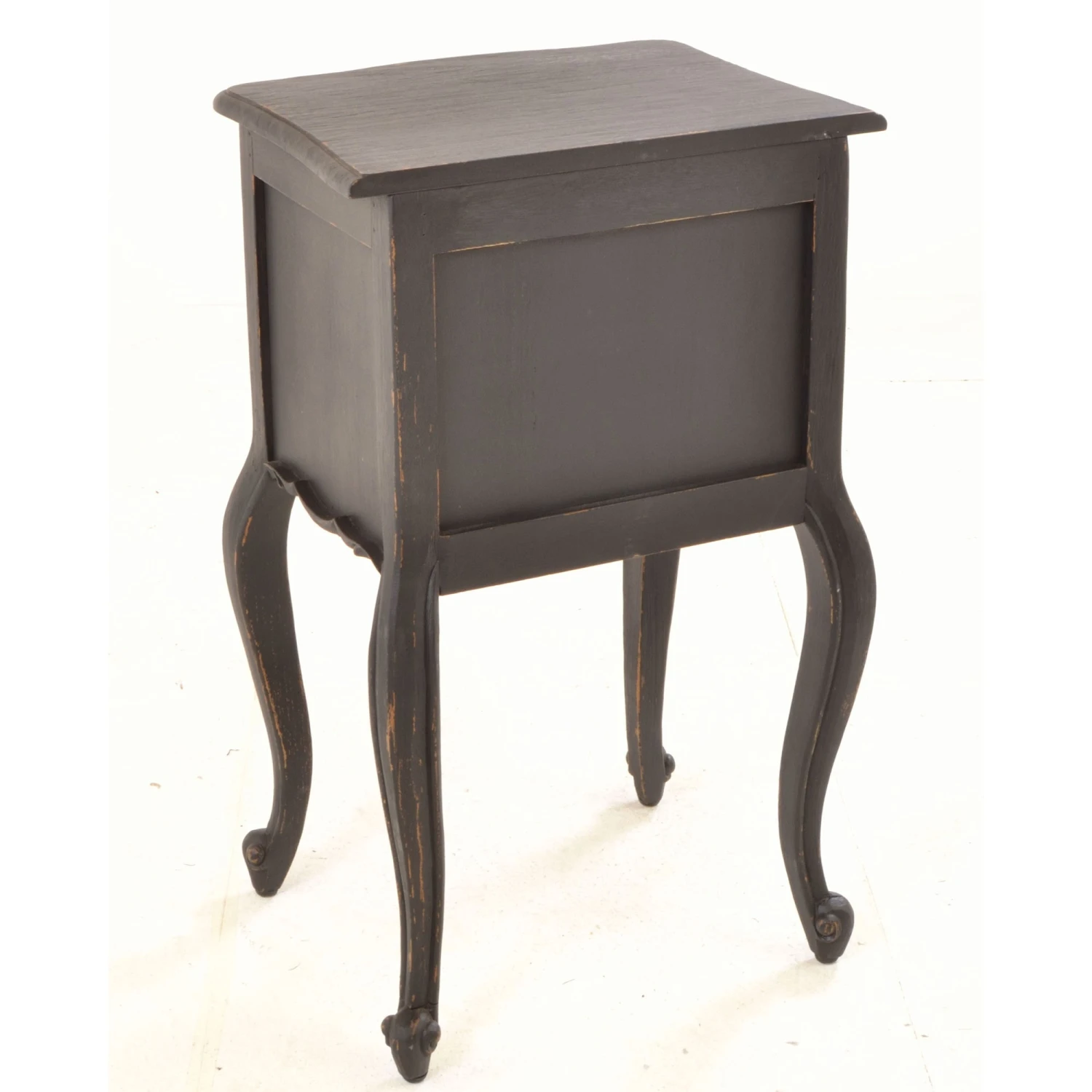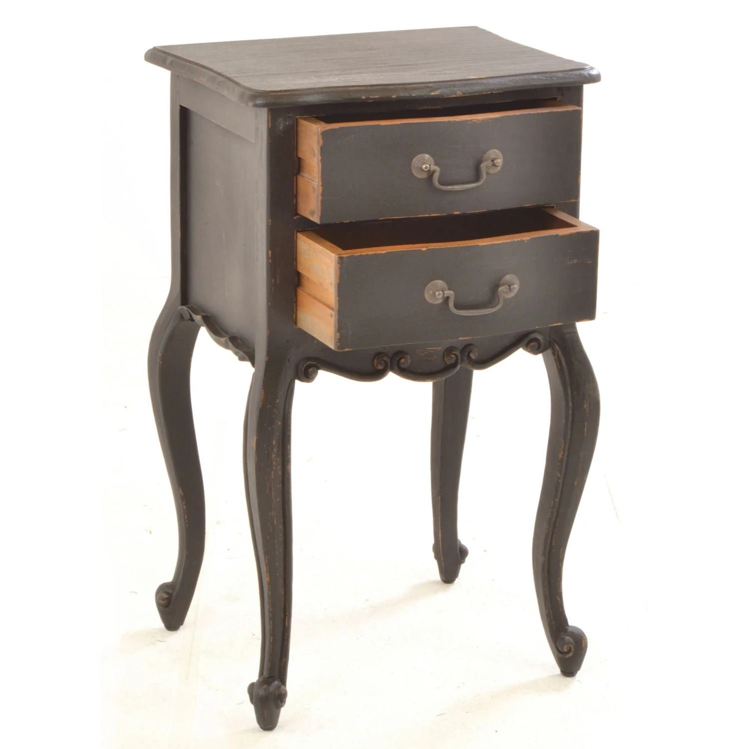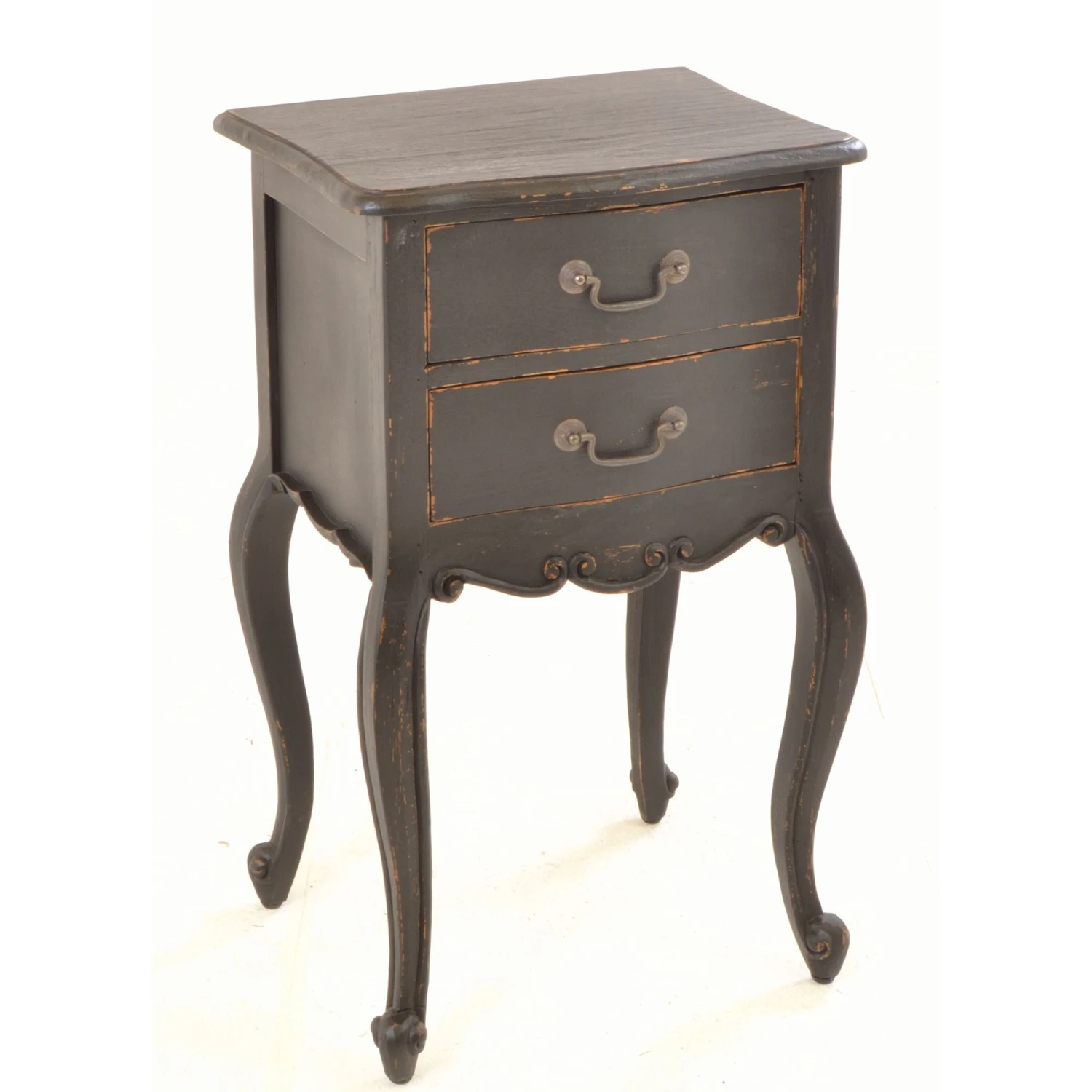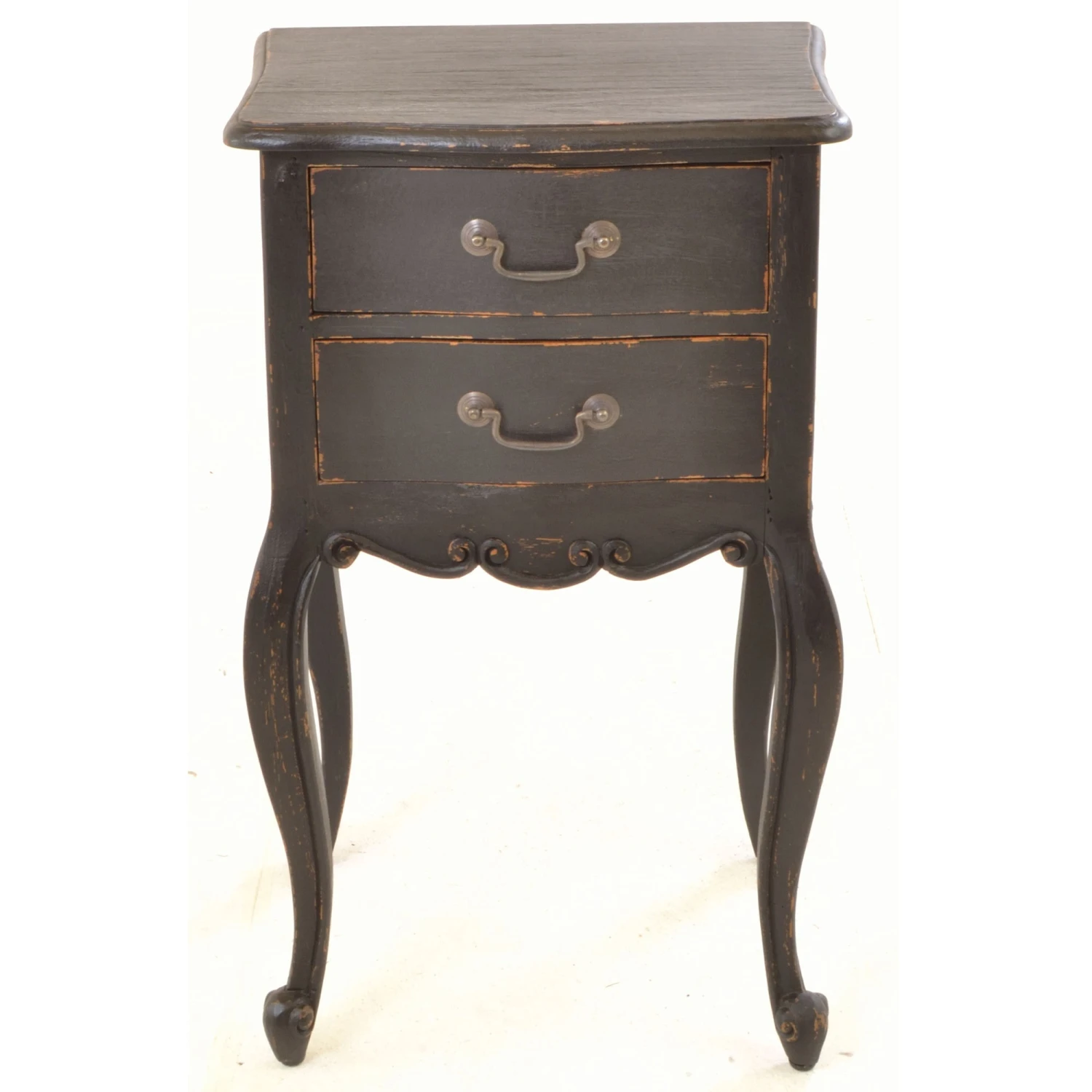 A beautiful french-inspired Vintage Black Side Table that has eye-catching ornate detailing that is delicately carved onto its front exterior to create this distressed black finished table, suitable for both a living room or bedroom. Coming with 2 drawers of storage, it’s crafted from solid mahogany wood and has cabriole curved legs and scrolled feet. A wonderful addition to any home, it will certainly impress and brings in a traditional French flair to add character and charm. Use as a side table by the side of furniture or a bedside table to store a table lamp on.