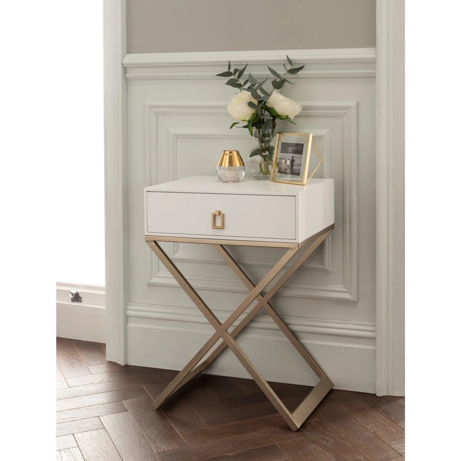 This stunning modern bedside table will brighten up any bedroom and will most certainly add a little style to your home. The cross legged design of this contemporary bedside table makes it a unique piece and will add the wow factor to any room.Â