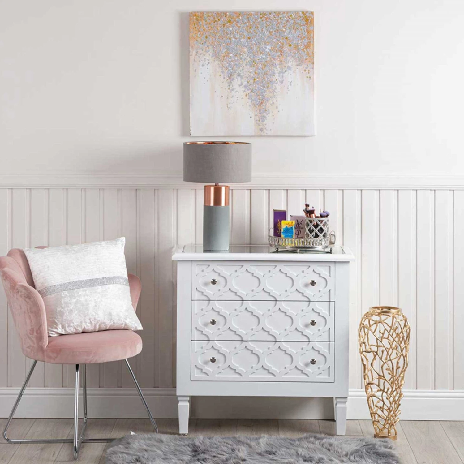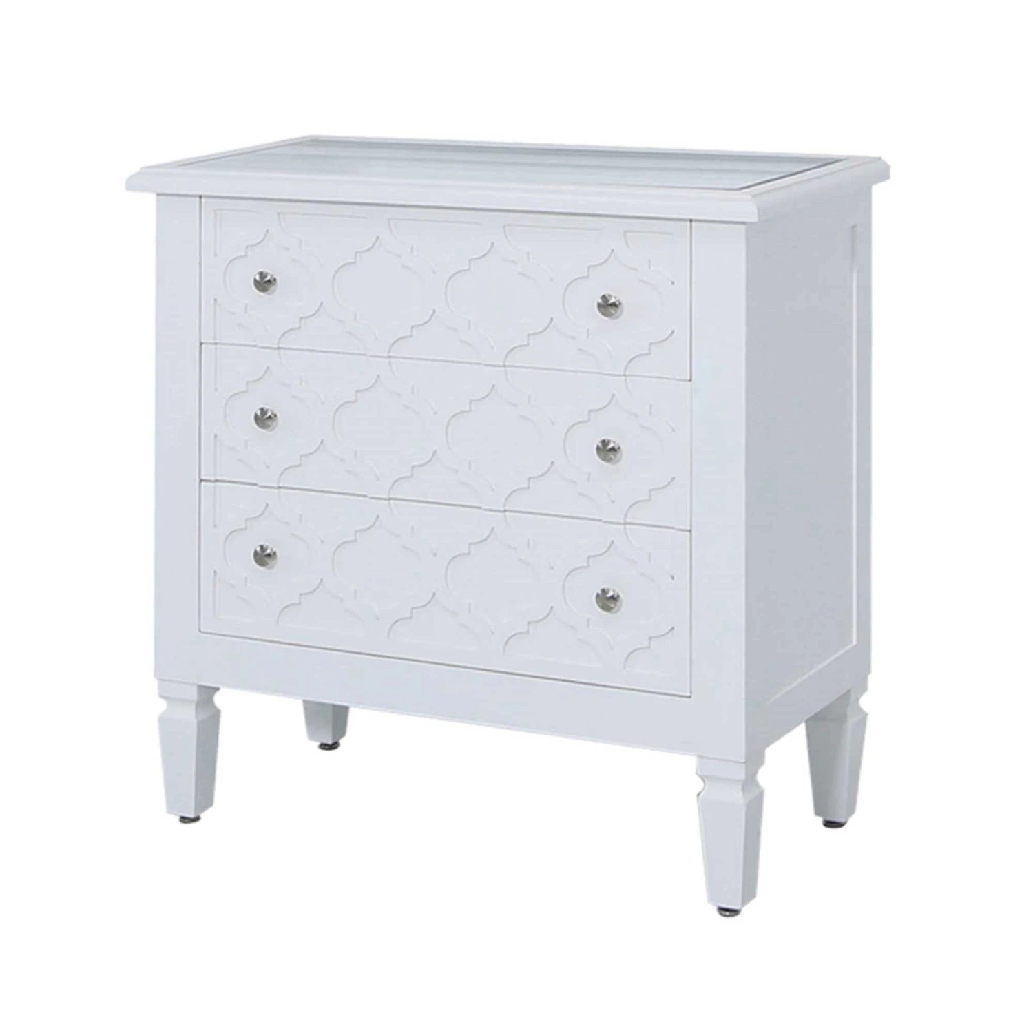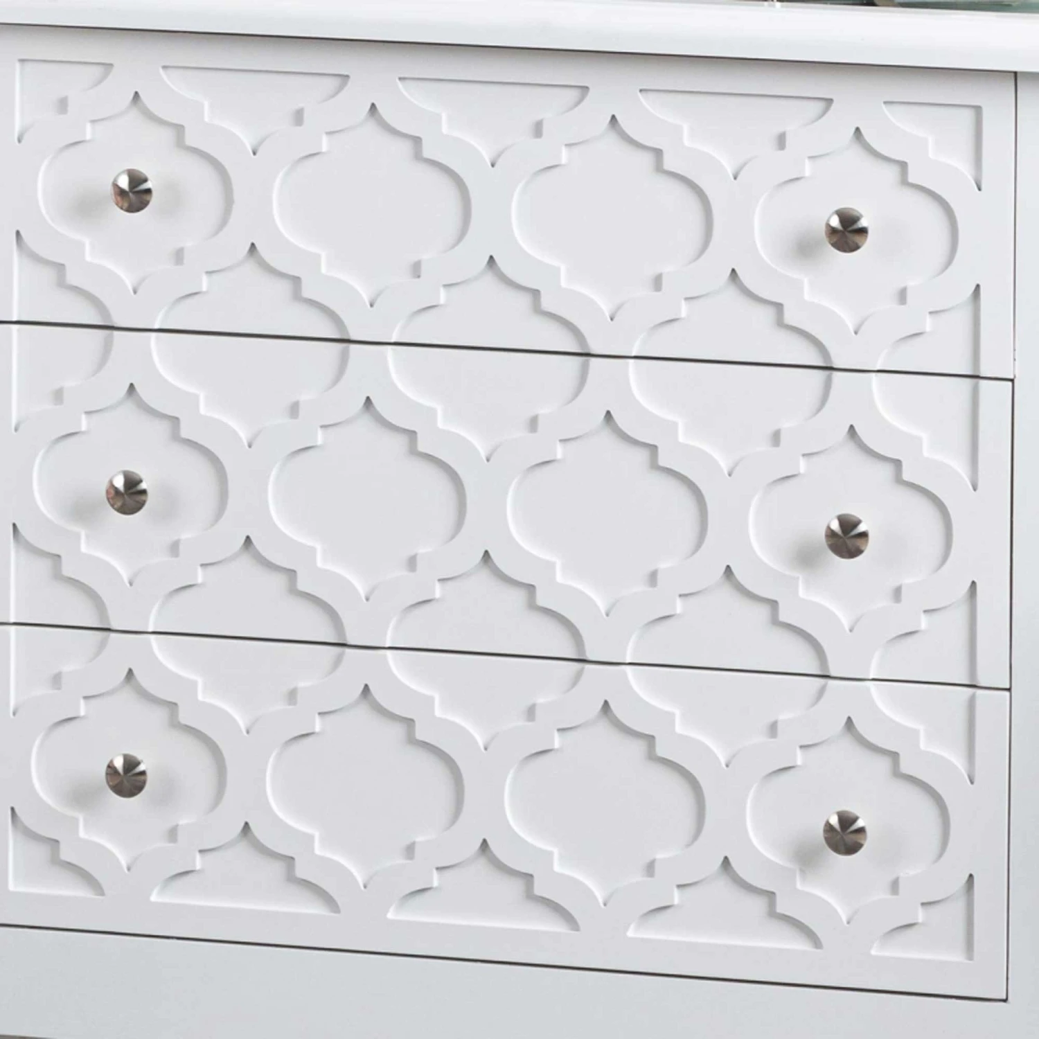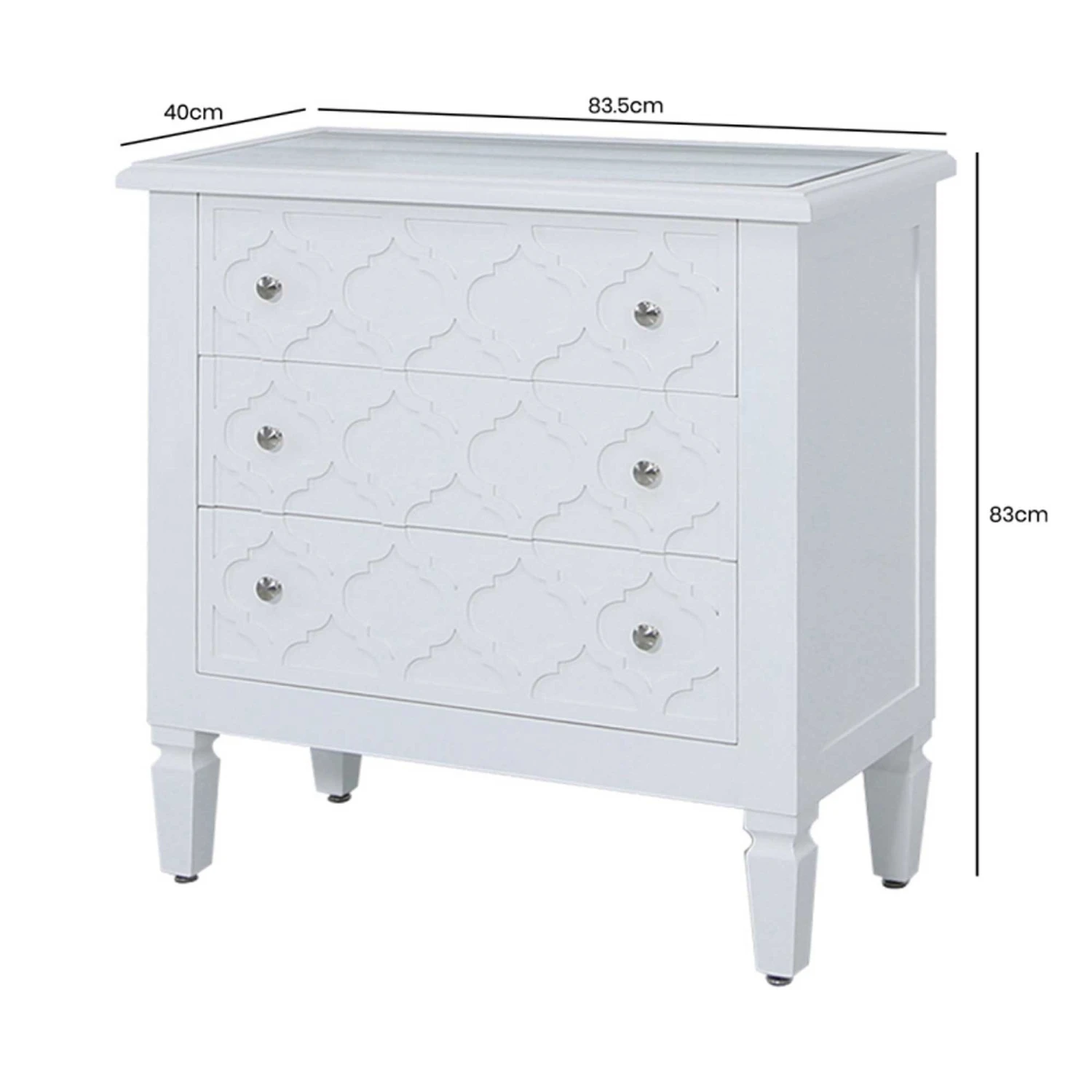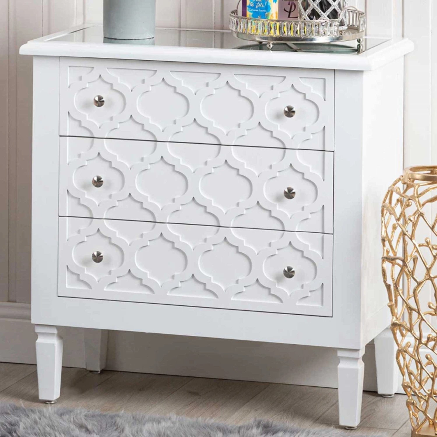 Add to your home interior with a simple splash of colour with the newest range to our collection of modern furniture, coming from the Benton Collection this beautiful White Benton Wooden Chest Of Drawers is made from solid wood and features a mirrored top that will reflect your current interior. Also having three spacious drawers for all your storage needs this Chest Of Drawers is a must have addition to add to your home interior.Â