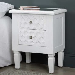Introduce this elegant White & Gold 1 Drawer Bedside Table to the side of your bed for a practical solution for storage and to hold your bedside lamp. Crafted from solid wood, it comes in a contrasting white and gold, giving a sophisticated look for your bedroom. With 1 drawer for storage, it can be used to store books, a sleep mask and essential oils for a relaxing night of sleep. Featuring a hexagon pattern on the drawer front, this super stylish design is a must-have, giving your room a contemporary makeover. To ensure a durable build, it comes with a cross base design for additional support, and you can place an alarm clock, photo frame or table lamp on top.